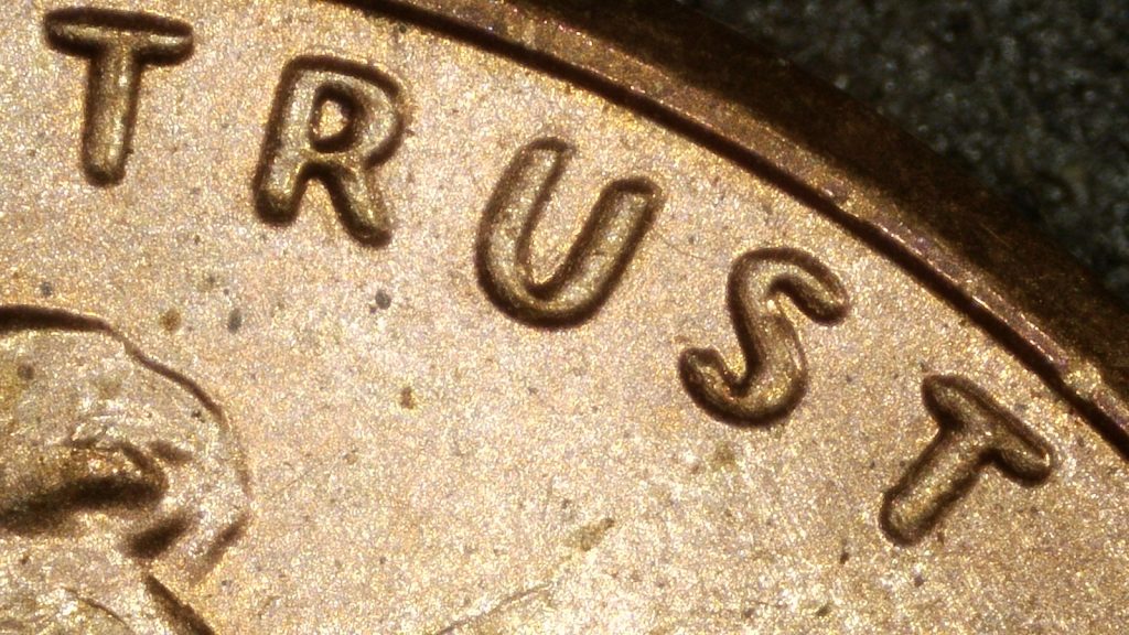 Detail of IN GOD WE TRUST showing subtle but consistent doubling in select letters. Note the puffiness of the U.